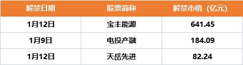 ➤Wind数据统计显示,本周(1月9日-1月13日)共有50家公司限售股陆续解禁,合计解禁量107.16亿股,按1月6日收盘价计算,解禁市值为1088.8亿元。解禁市值居前三位的是:宝丰能源(641.45亿元)、电投产融(184.09亿元)、天岳先进(82.24亿元)。