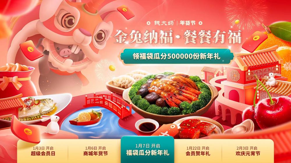 寻年味办年货,享地道年夜饭。钱大妈从产品促销堆头的陈列、商品价格的标签,到“年味儿”系列的主题视觉、年味儿时令美食,围绕家庭团聚场景,打造了立体消费新体验,给每个家庭带来温暖、丰富、多元化的年夜饭选择。