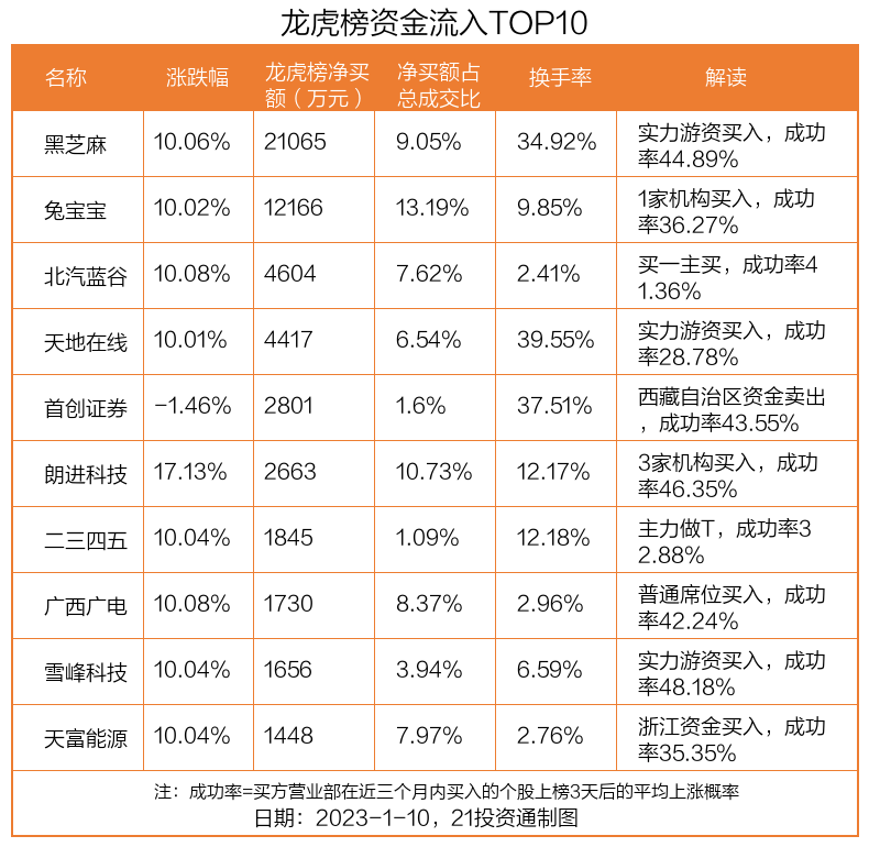 1月10日,上证指数下跌0.21%,深证成指上涨0.49%,创业板指上涨1.38%。盘后龙虎榜数据显示,共有27只个股因当日异动登上龙虎榜,资金净流入最多的是黑芝麻(000716.SZ),达2.11亿元。