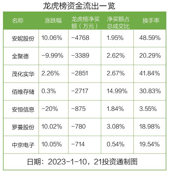 而龙虎榜中资金净流出最多的是安妮股份(002235.SZ),被净卖出为0.48亿元,占总成交金额的1.95%。安妮股份收盘上涨10.06%,换手率为48.59%。