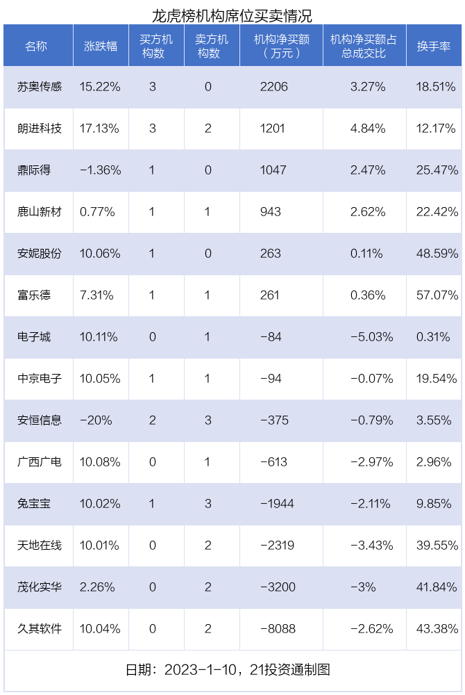 其中,机构净买入金额最多的是苏奥传感(300507.SZ),当日收盘上涨15.22%,换手率为18.51%。