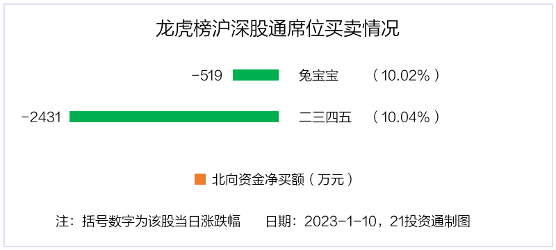 1月10日,北向资金参与龙虎榜中的个股共有2只,合计净卖出2950.1万元,均为深股通参与。