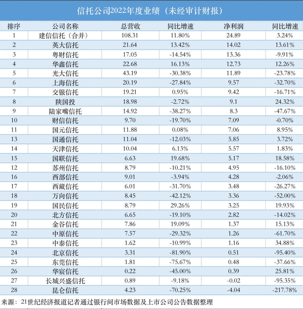 28家信托公司2022年财报披露:建信暂居第一 超半数净利润同比下降(附表)