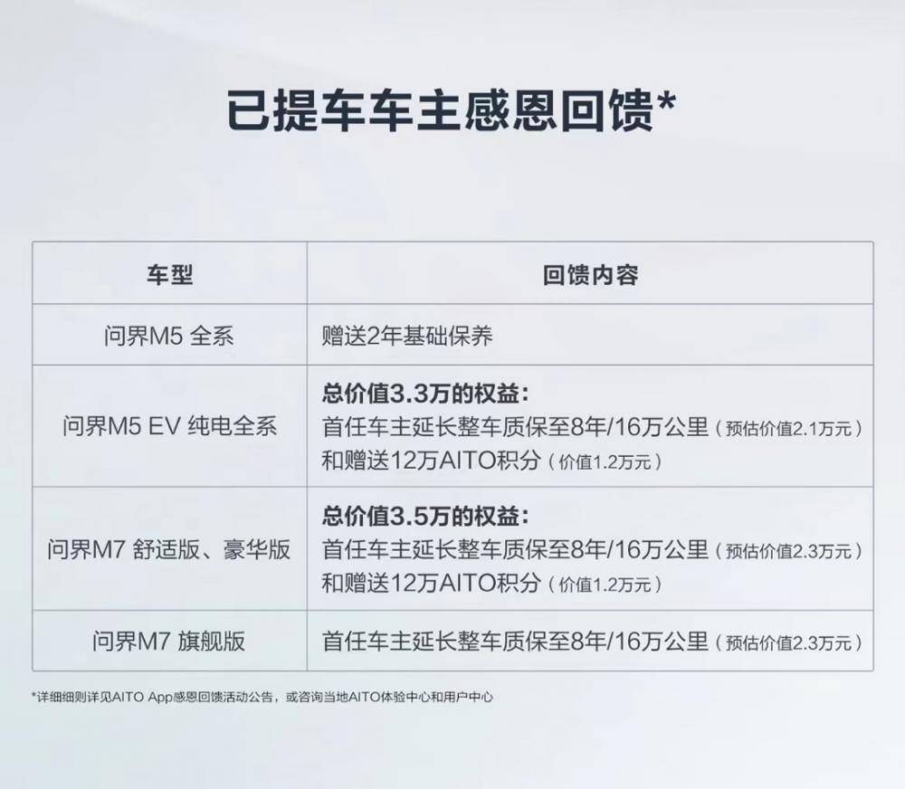 同时,为保障问界新老用户权益,赛力斯将对已提车车主实行了相应的回馈措施:为首任车主提供总价值3.3-3.5万的权益,包括价值2.1-2.3万的延长整车质保至8年/16万公里和价值1.2万的12万AITO积分,积分可在AITO商城内选购丰富的华为产品和周边产品,问界M5全系可享2年的基础保养。