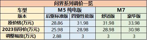继特斯拉官宣降价后,1月13日,赛力斯也宣布了问界系列的调价消息。据悉,1月13日8点30分起,赛力斯问界系列部分车型执行新年新价格,问界M5纯电版调整后售价为25.98万元起,问界M7调整后售价为28.98万元起。此前,这两款车的起售价分别为28.86万元和31.98万元。