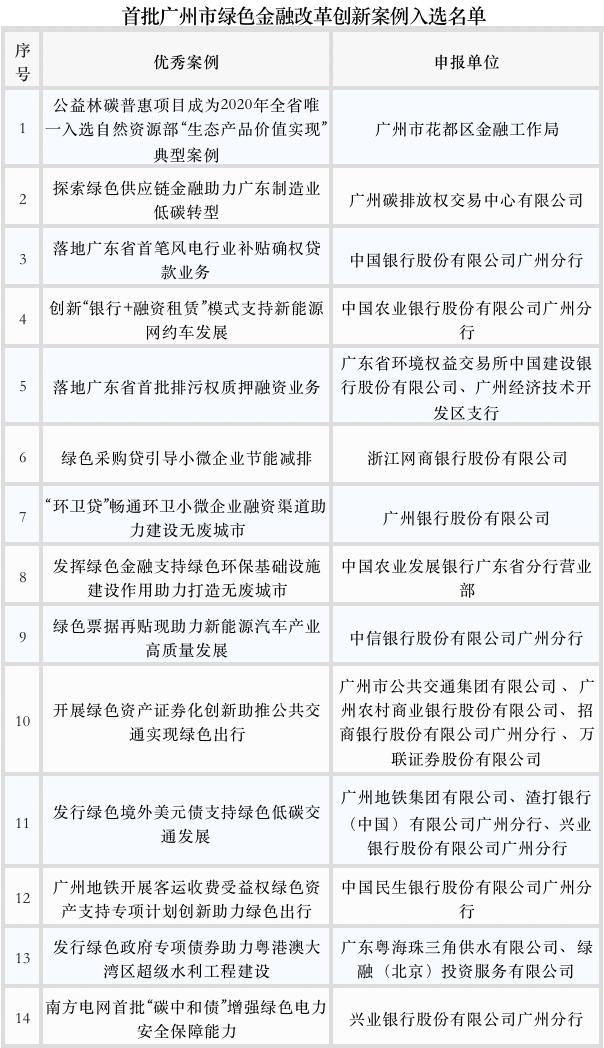 为积极贯彻落实国家“碳达峰、碳中和”重大决策部署,深入推进广州市绿色金融改革创新试验区建设,广泛宣传普及绿色金融和绿色发展理念,大力推广和复制优秀案例,推动广州绿色金融高质量发展,在广州市地方金融监督管理局的指导下,广州市绿色金融协会于2021年10月正式组织开展首届广州市绿色金融改革创新案例征集活动,经初选、复审、终审、公示等环节,最终遴选出30个首批广州市绿色金融改革创新案例,并于2022年1月对外公布展示。