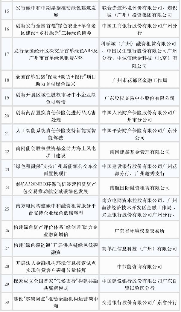 该批入选的30个创新案例在推动绿色金融改革创新发展起到示范引领作用,覆盖政府、银行、证券、保险、基金、融资租赁、环境权益、绿色实体、服务中介等部门和机构,涉及金融支持绿色企业低碳转型、绿色交通、绿色基础设施升级、绿色新能源、绿色生态农业、绿色建筑等方面,多维度多角度展示广州绿色金融改革创新成果,有力地促进广州绿色金融高质量发展。