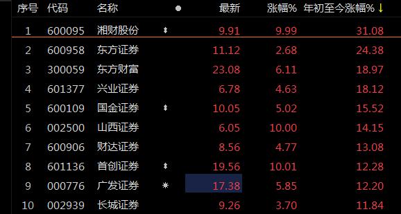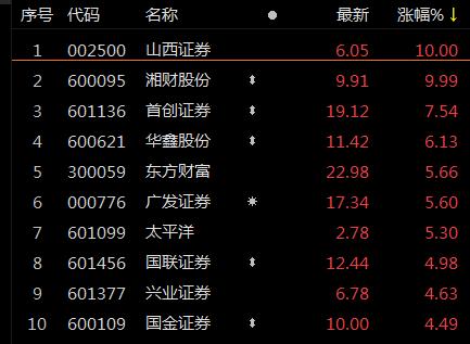 截至发稿,山西证券、湘财股份双双涨停,首创证券、华鑫股份、东方财富、广发证券、太平洋等跟涨。