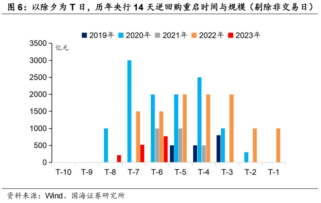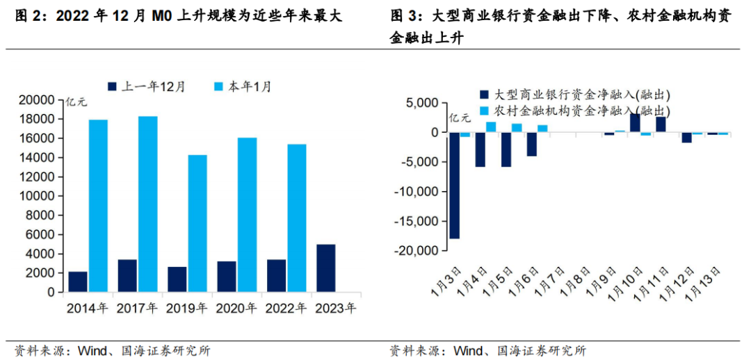 特别是大批在外务工人群在旅行限制措施取消后,2023年春节携现金返乡探亲的需求强烈。从数据上来看,2022年12月底前,已经有部分务工人群提前提取现金返乡,并且推动2022年12月M0环比上升4960亿元。对比2014年以来的可比年份(春节位于1月或2月初),2022年12月M0增幅为近些年同期最大。因此我们判断,2023年民众春节前取现需求或较往年更高,并对资金面产生更大扰动。