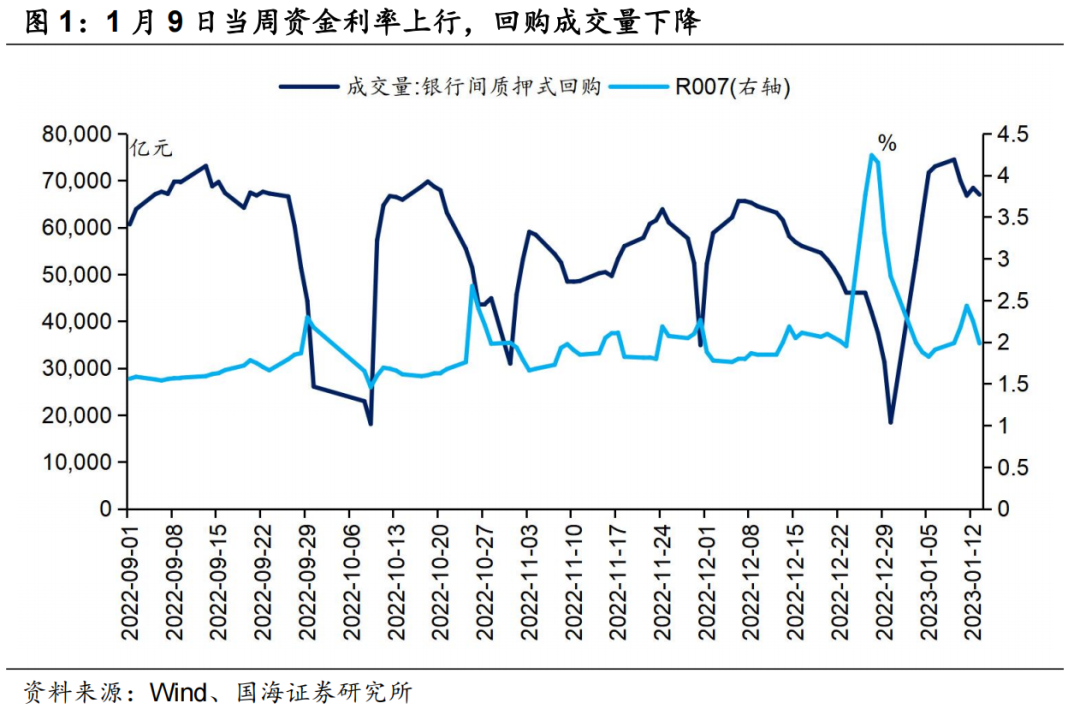 2023年1月9日当周,银行间资金面出现大幅波动,1月11日R007加权平均利率一度上行至2.43%。由于彼时资金并未跨季或跨节,所以这一偏高的利率水平,反映出资金面确实一度紧张。