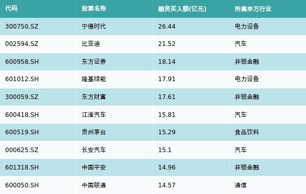 上周两市共有3109只个股有融资资金买入,共有18只个股买入金额超10亿元,其中宁德时代、比亚迪、东方证券排名前三,买入金额分别26.44亿元、21.52亿元、18.14亿元。融资买入额前10个股详情见下表: