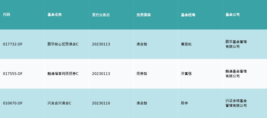 上周有3只新基金发行,分别为:鹏华核心优势混合C、融通增享纯债债券C、兴全合兴混合C,详情见下表: