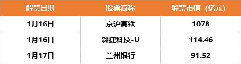 从解禁市值来看,按1月13日收盘价计算,解禁市值居前三位的是:京沪高铁(1078亿元)、翱捷科技-U(114.46亿元)、兰州银行(91.52亿元)。