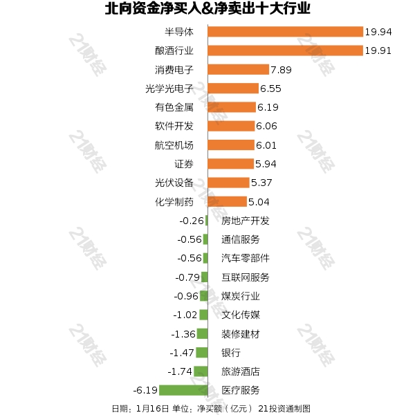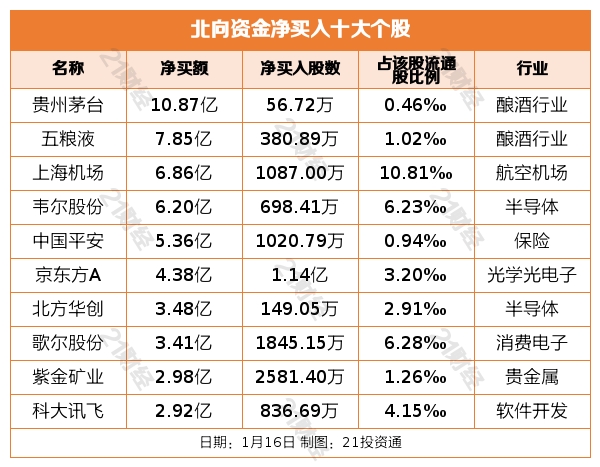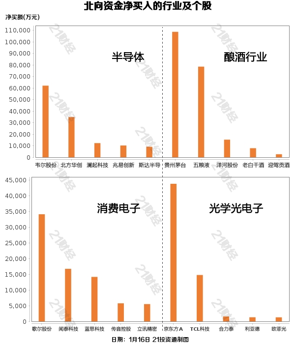 据21投资通智能监测,1月16日,北向资金净买入158.43亿元,其中沪股通净买入83.55亿元,深股通净买入74.88亿元。北向资金已经连续两日逾百亿扫货,连续9日录得净流入,1月份以来累计买入净额高达798.58亿元。