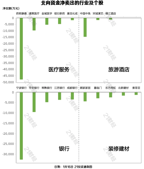 北向资金减持了15个行业,其中医疗服务最多,净卖出金额达6.19亿元,其次是旅游酒店行业,净卖出1.74亿元。