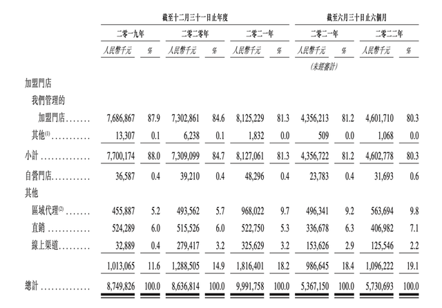 2022年上半年,百果园来自加盟门店的收入为46亿元,占营收的比例为80.3%;来自自营门店的营收为3169万元,占营收比例为0.6%;来自区域代理的收入为5.63亿元,占营收比例为9.8%。