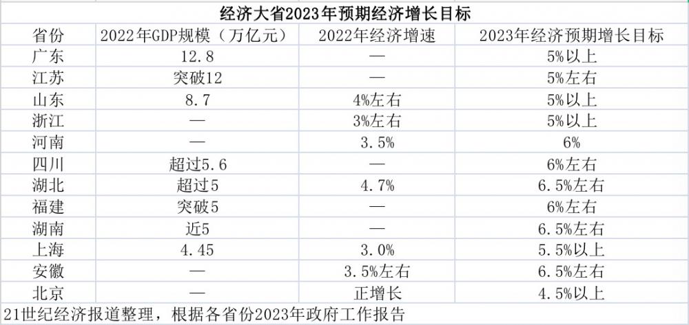 比如,广东预计2022年全省地区生产总值达12.8万亿元,预期2023年经济增长5%以上。江苏2022年GDP预计突破12万亿元,预期2023年经济增速在5%左右。山东预计2022年GDP达到8.7万亿元,同比增长4%左右,预期2023年经济增长5%以上。浙江预计2022年GDP增长3%左右,预期2023年GDP增速在5%以上。