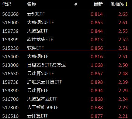 ETF方面,云、大数据、软件等信创相关ETF涨幅明显。截至发稿,云50ETF(560660)涨2.65%,大数据50ETF(516000)涨2.61%,大数据ETF(159739)、软件龙头ETF(159899)、软件ETF(515230)、大数据ETF(515400)等均涨超2.5%。