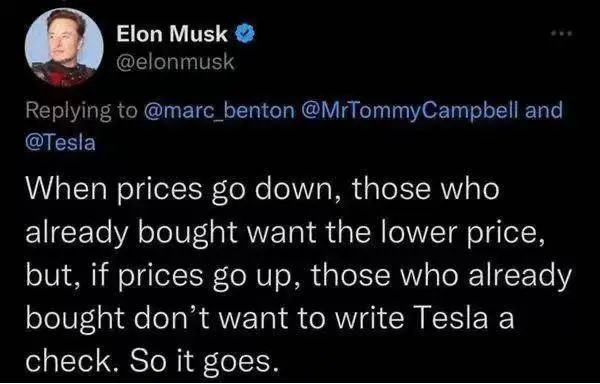 当特斯拉价格下跌时,已经购买的人想要更低的价格,但是如果价格上涨,已经购买的人不想给特斯拉开(补价)支票,就这样吧。