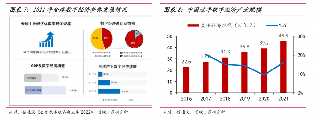 国联证券分析,根据信通院《全球数字经济白皮书2022》报告,2021年47个国家数字经济增加值规模为38.1万亿美元,同比增长15.6%,占GDP比重为45.0%。产业数字化仍是数字经济发展的主引擎,占数字经济比重为85%,其中,第三产业数字化引领行业转型发展。2021年中国数字经济规模约为45.5万亿元,占GDP比重约39.6%,低于美国的65%,仍有较大提升空间。