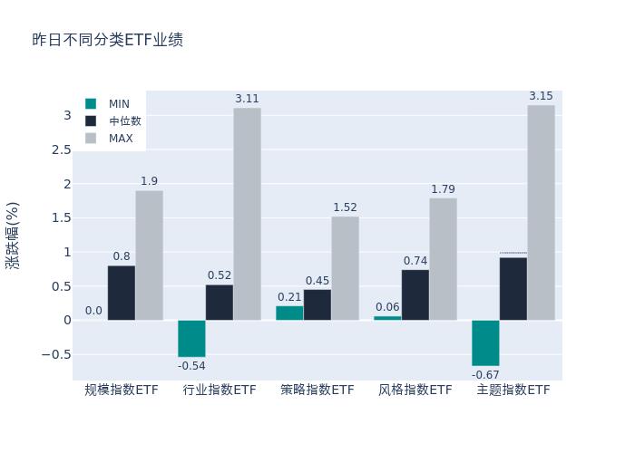 昨日股票型ETF收益率中位数为0.74%。其中按照不同分类,规模指数中鹏华上证科创板50成份增强策略ETF收益率最高,为1.9%;行业指数中国泰中证全指软件ETF收益率最高,为3.11%;策略指数中华夏创蓝筹ETF收益率最高,为1.52%;风格指数中嘉实医药健康100ETF收益率最高,为1.79%;主题指数中华富中证人工智能产业ETF收益率最高,为3.15%。