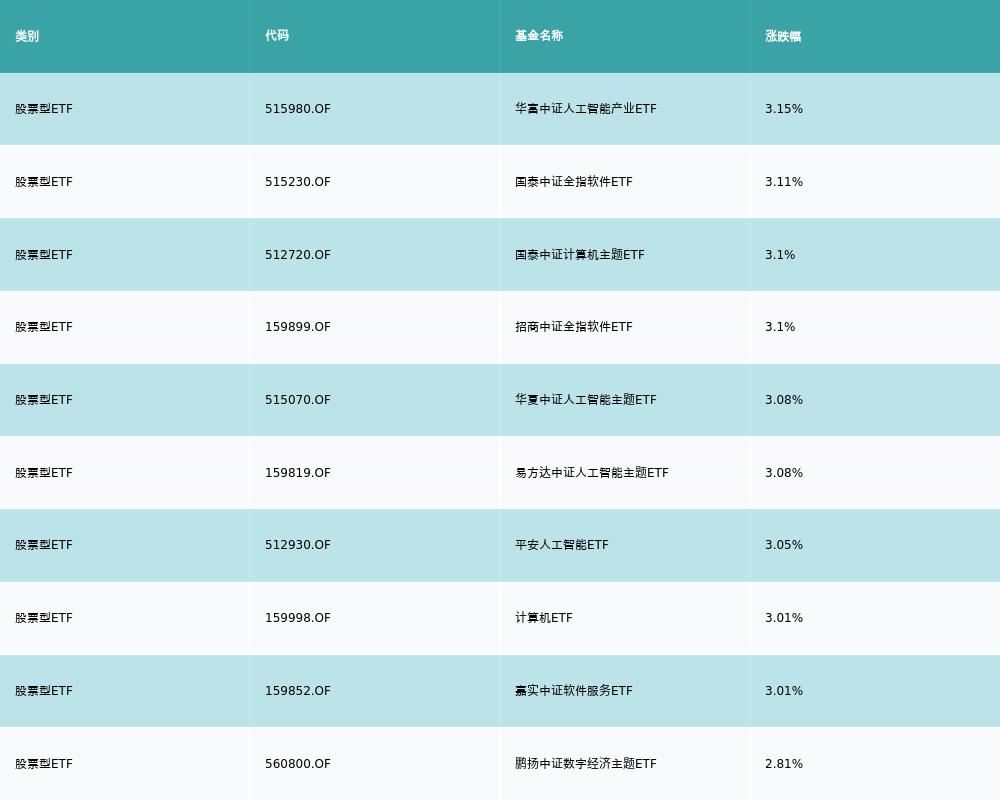 昨日股票型ETF涨幅最高的3支ETF及其收益率分别为:华富中证人工智能产业ETF(3.15%)、国泰中证全指软件ETF(3.11%)、国泰中证计算机主题ETF(3.1%)。涨幅前10详情见下表: