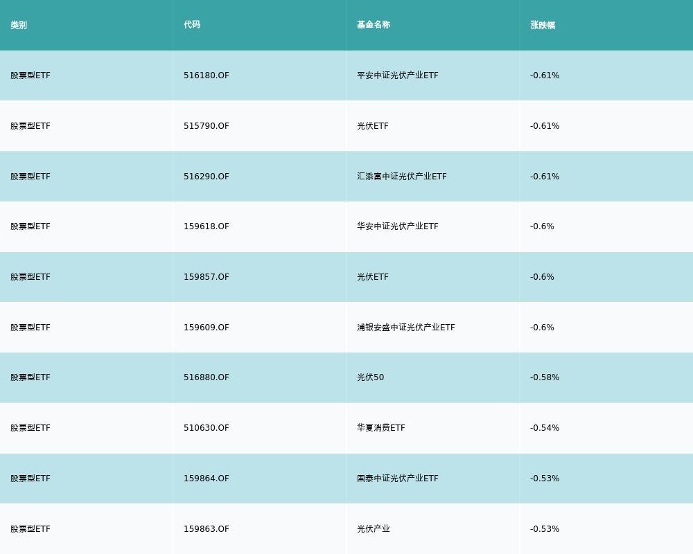 昨日股票型ETF跌幅最大的3支ETF及其收益率分别为:平安中证光伏产业ETF(-0.61%)、光伏ETF(-0.61%)、汇添富中证光伏产业ETF(-0.61%)。跌幅前10详情见下表: