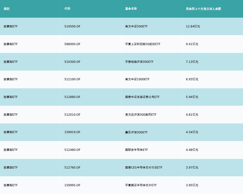 昨日股票型ETF资金流入最多的3支ETF及其流入金额分别为:南方中证500ETF(流入12.84亿元)、华夏上证科创板50成份ETF(流入9.41亿元)、华泰柏瑞沪深300ETF(流入7.13亿元)。资金流入前10详情见下表: