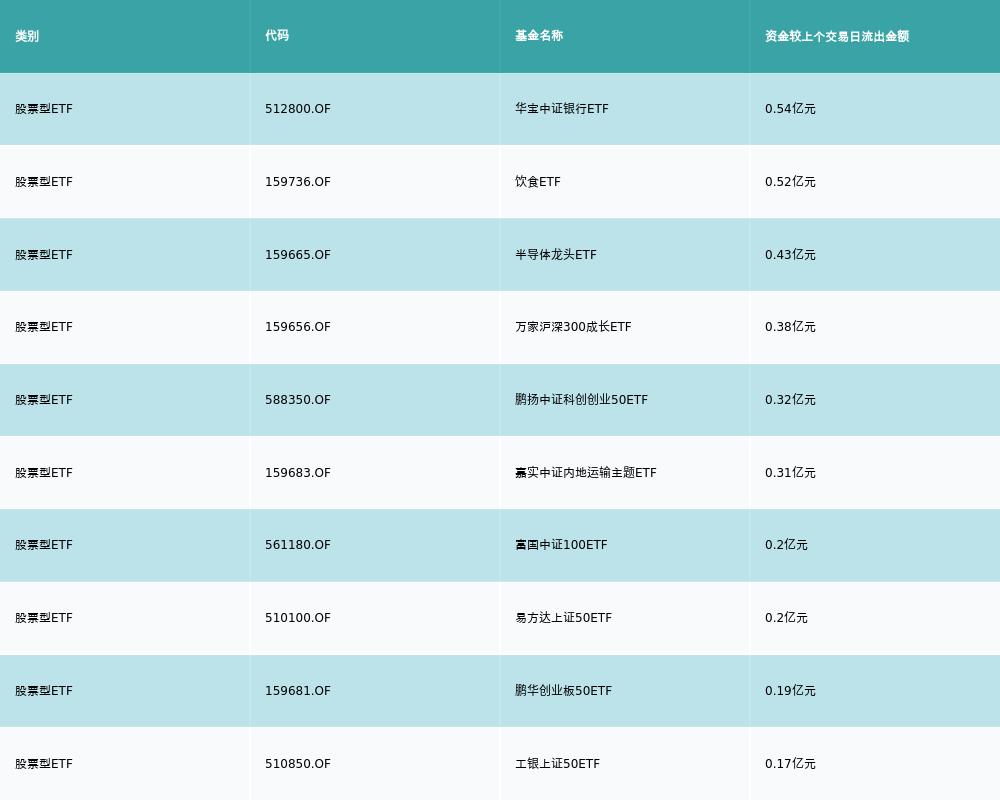 昨日股票型ETF资金流出最多的3支ETF及其流入金额分别为:华宝中证银行ETF(流出0.54亿元)、饮食ETF(流出0.52亿元)、半导体龙头ETF(流出0.43亿元)。资金流出前10详情见下表: