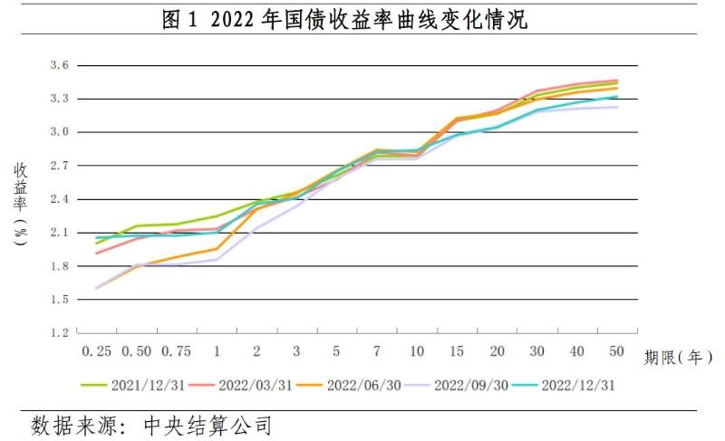 2022年12月末,1年、3年、5年、7年、10年期国债收益率分别为2.10%、2.40%、2.64%、2.82%、2.84%,分别较2021年同期下行15个基点、5个基点和上行4个基点、4个基点、6个基点。2022年末,中债国债总指数收盘价为213.7,较2021年末上涨7.1;中债新综合全价指数收盘价为122.1,较2021年末上涨0.6。