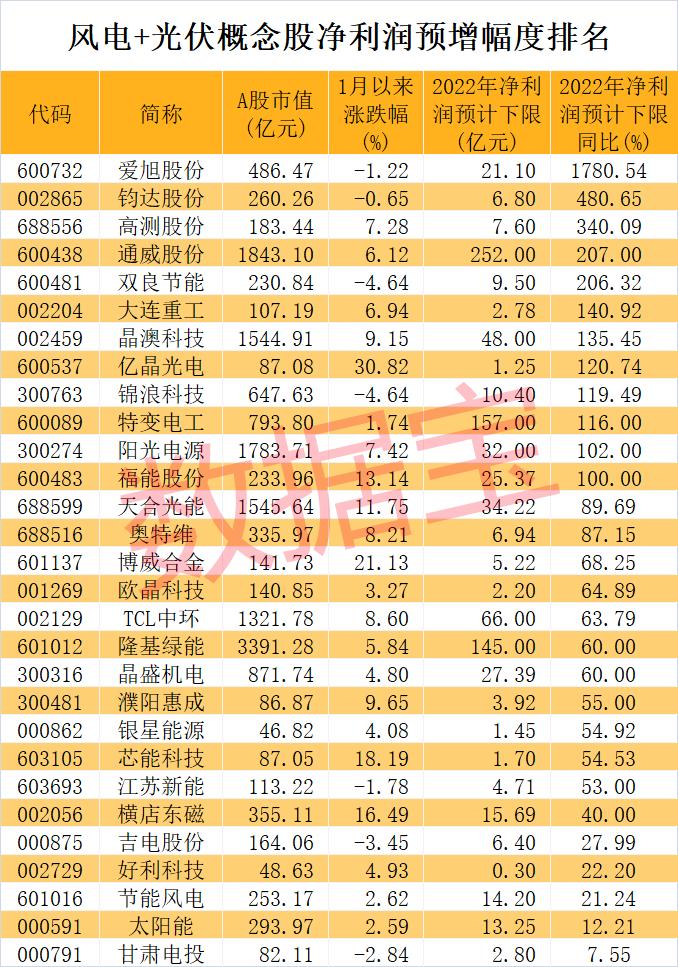 证券时报·数据宝统计,风电、光伏两大板块中,目前已有30股公布业绩预告数据。按照净利润预计下限计算,超九成股票2022年净利润为增长状态,其中四成概念股净利润增幅预计翻倍。