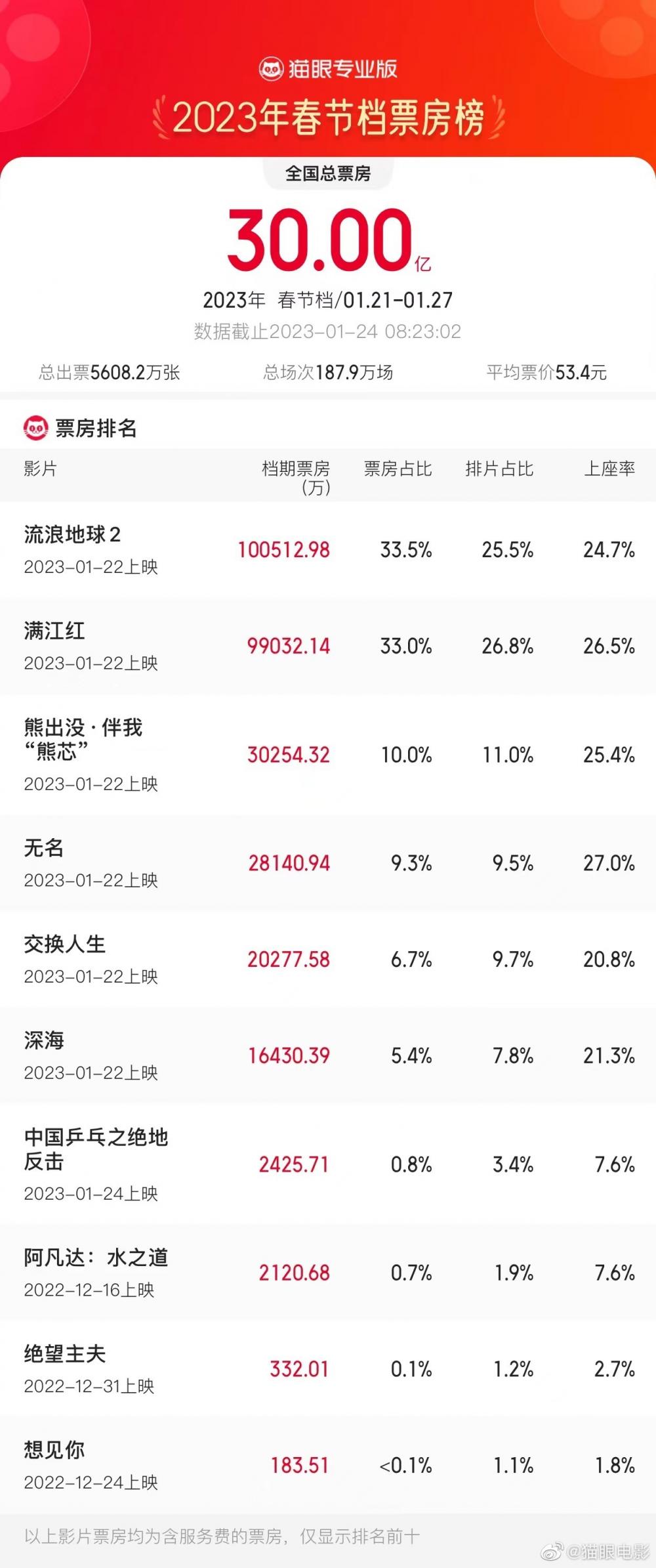 据猫眼专业版数据,2023年1月24日8时23分,2023年春节档(1月21日-1月27日)总票房(含预售)破30亿元!《流浪地球2》《满江红》《熊出没·伴我“熊芯”》分列春节档票房前三位。