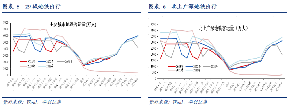 观察腊月二十四至正月初三地铁出行数据。十日合计看,北上广深低于去年,也低于2019年,同比为-12.8%。北上广深之外的20多个城市,好于去年,同比为2.4%。整体上29个城市的地铁数据看,同比为-5.5%。