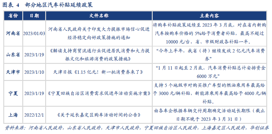 1月,部分地区将去年的补贴政策予以延续。例如河南,将购车补贴政策延续至2023年3月底,对在省内新购汽车按购车价格的5%给予消费者补贴,最高不超过10000元/台,省、市级财政各补贴一半。