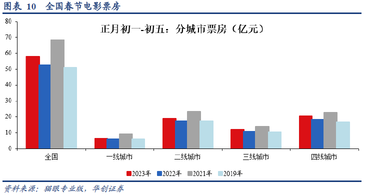 分城市能级看,今年春节档电影票房增量主要来自四线城市。初一至初五,全国电影票房相比去年同期增加5.13亿。其中,一、二、三、四线城市增量分别是0.08亿、1.59亿、1.12亿、2.32亿。如果观察电影票房的城市占比,今年春节四线城市票房占比为35.4%,高于2022年的34.5%、2021年的33.1%、2019年的32.9%。