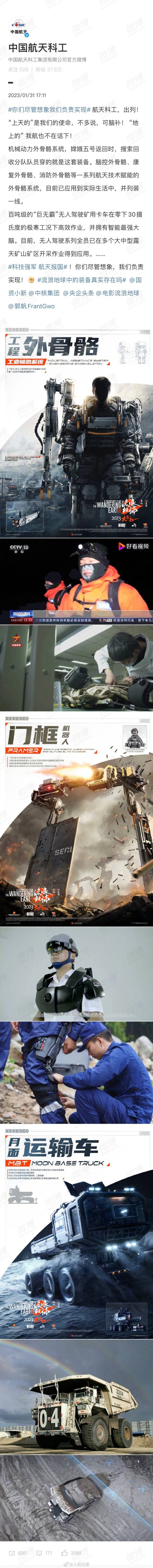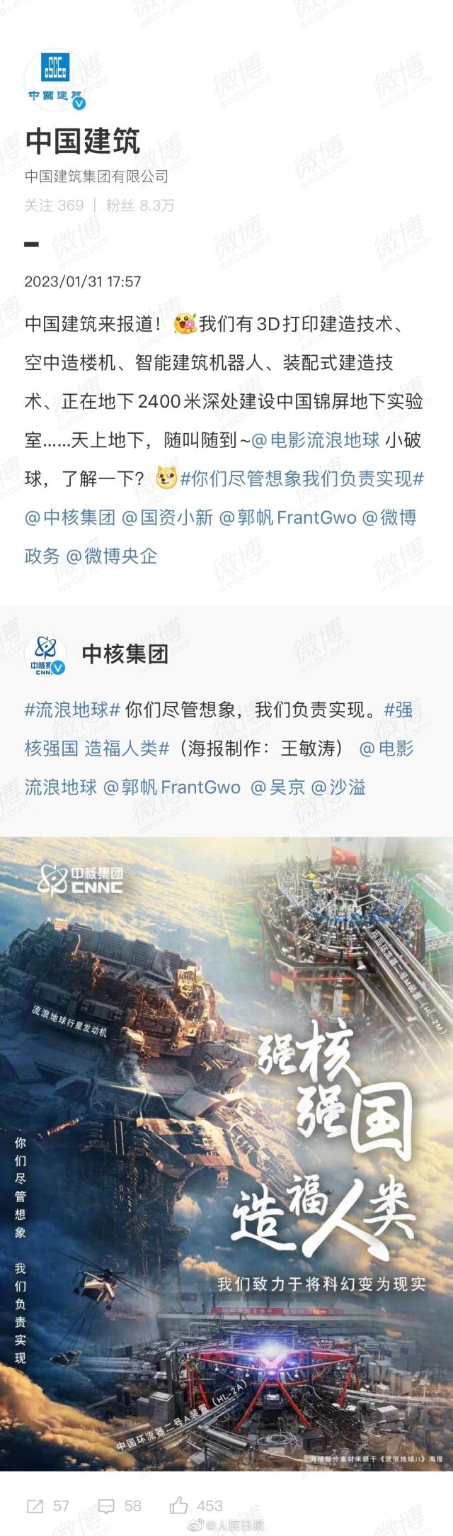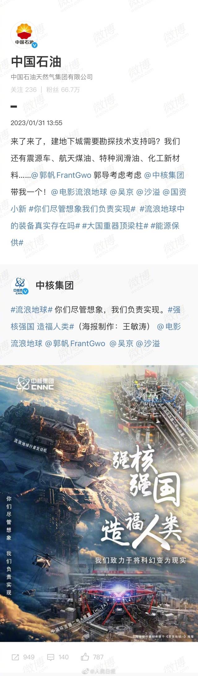 “你们尽管想象,我们负责实现。”继中核集团喊话电影《流浪地球2》后,中国航天科技集团、中国建筑、中国石油、中国石化、中粮集团等国家队“团建式”前来报到。网友:整整齐齐的国家队排面,这联动太硬核了!
