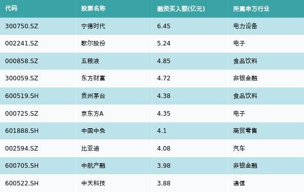 1月31日,两市共有3108只个股有融资资金买入,其中宁德时代、歌尔股份、五粮液排名前三,买入金额分别6.45亿元、5.24亿元、4.85亿元。融资买入额前10个股详情见下表: