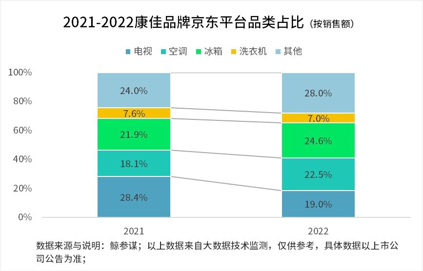 鲸参谋数据显示,同比2021年,2022年康佳品牌内在京东渠道的产品结构出现了明显变化,冰箱和空调在销售额分别同比增长31.77 %、45.76 %的基础上,销售额占比也明显提升。这说明,康佳集团把握住了白电市场率先复苏的市场机遇,推动了产品结构的进一步多元化,从而尽可能地降低了彩电市场相对疲软的负面影响。
