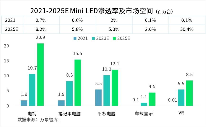 据万象智库数据,至2025年,Mini LED将呈现超高速增长趋势,电视市场将达2090万台,较2021年增长1000%;笔记本当年将达1550万台,较2021年增长超700%;而已经在2021年依靠苹果iPad系列全面应用的平板电脑,仍有望在2025年实现120%增长;而车载显示、VR等新兴显示市场,有望在2023年全面加速应用并实现快速增长。