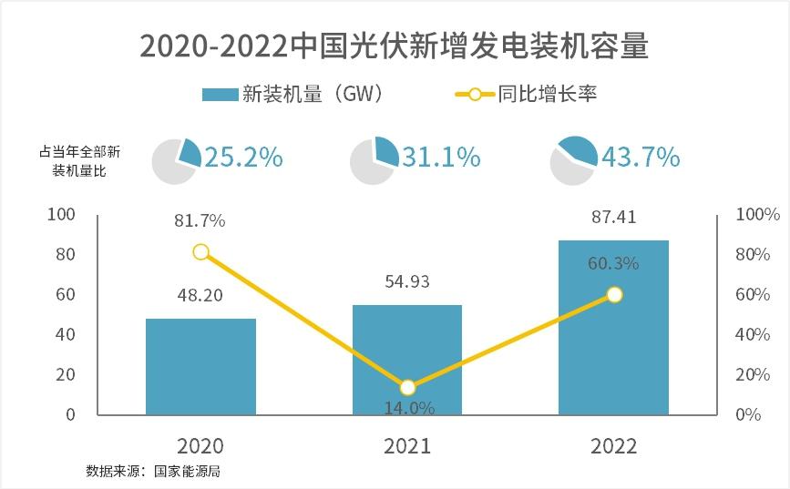据国家能源局数据,2022年我国光伏新增发电装机容量达到87.41 GW,同比增长60.3%,光伏在各类新增发电装机容量中的占比从2020年的25.2%提升到了43.7%,光伏发电在我国能源结构中的重要性得到了进一步提升。预计,随着全国各地“十四五”建设项目的持续推进,未来三年有望达到年均新增100 GW以上。