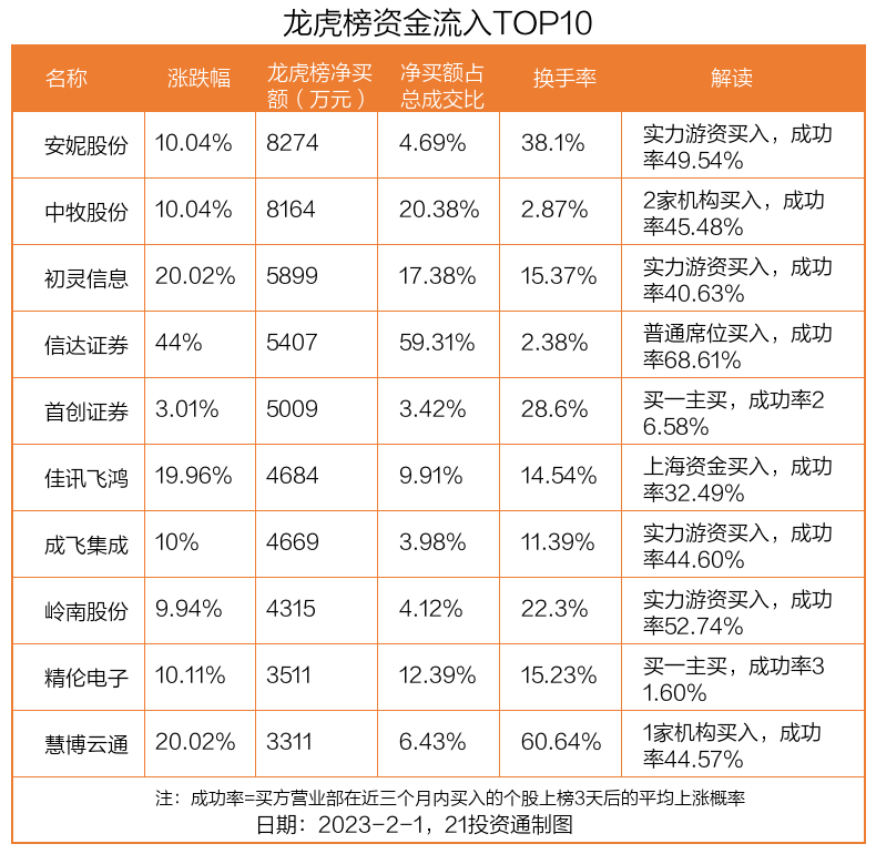 2月1日,上证指数上涨0.9%,深证成指上涨1.31%,创业板指上涨1.27%。盘后龙虎榜数据显示,共有35只个股因当日异动登上龙虎榜,资金净流入最多的是安妮股份(002235.SZ),达0.83亿元。