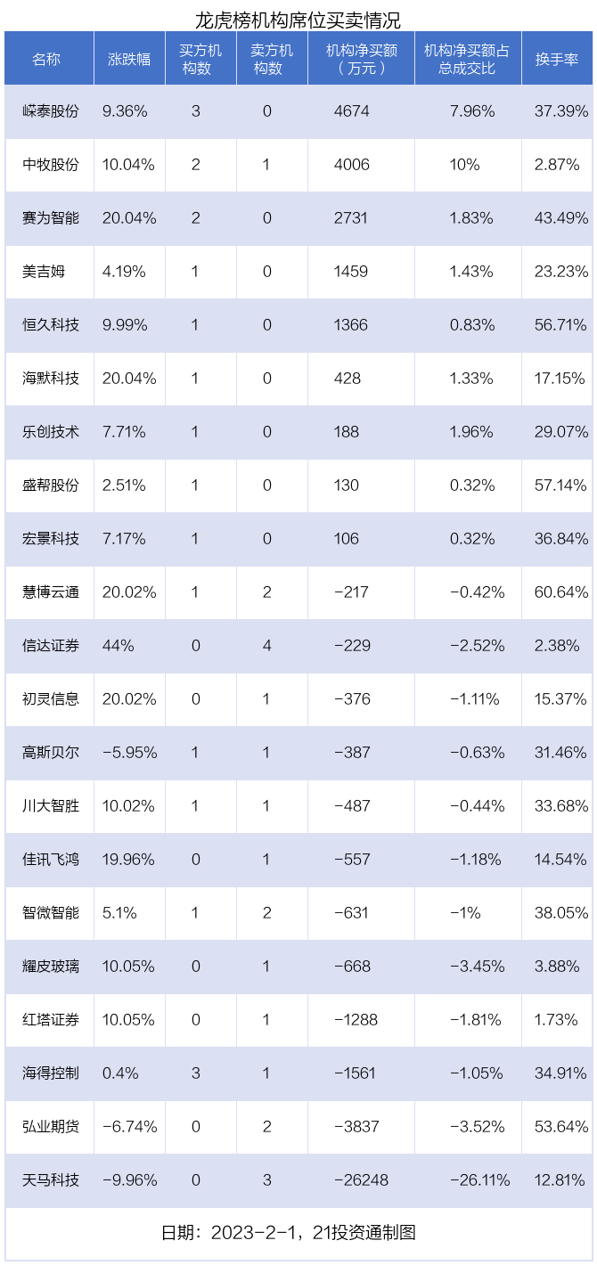 2月1日,21只个股龙虎榜出现了机构的身影,机构合计净卖出2.14亿元。具体来看,机构净买入9股,净卖出12股。