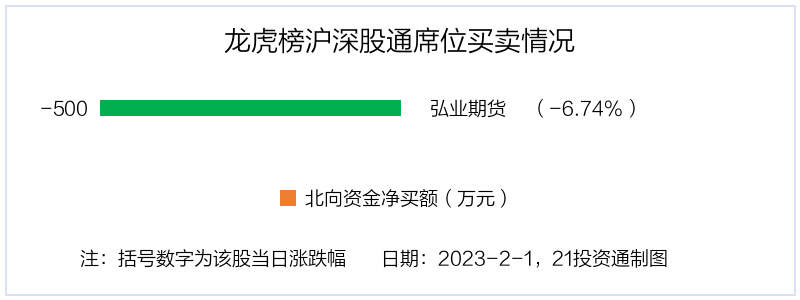 2月1日,北向资金参与龙虎榜中的个股只有1只——弘业期货(001236.SZ),净卖出额为499.6万元。