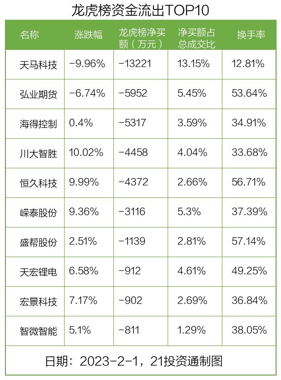 而龙虎榜中资金净流出最多的是天马科技(603668.SH),被净卖出为1.32亿元,占总成交金额的13.15%。天马科技收盘下跌9.96%,换手率为12.81%。
