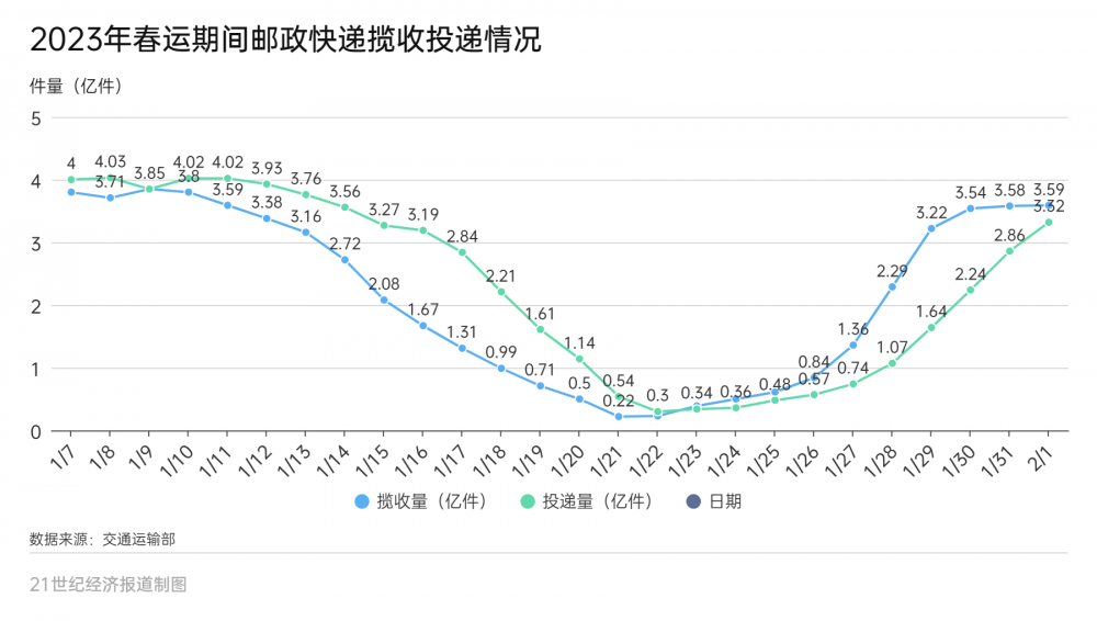 21世纪经济报道记者根据国务院物流保通保畅工作领导小组办公室监测汇总数据,统计了1月7日至2月1日之间的快递揽收与投递件量情况。