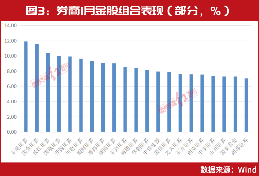 回顾券商的1月金股组合绩效,随着市场整体反弹,40余家推出1月金股的组合表现均实现上涨。东莞证券、国金证券、长江证券等多家券商的1月金股指数涨幅则均超过10%,其中,东莞证券、国金证券的金股指数涨幅分别达11.91%与11.59%,分别位列第一、第二(见图3)。