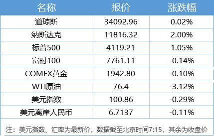 2、随着美联储加息的靴子落地,隔夜美股在尾盘阶段显著拉升。截至收盘,纳指涨2%,报11816.32点;标普500指数涨1.05%,报4119.21点;道指涨0.02%,报34092.96点。