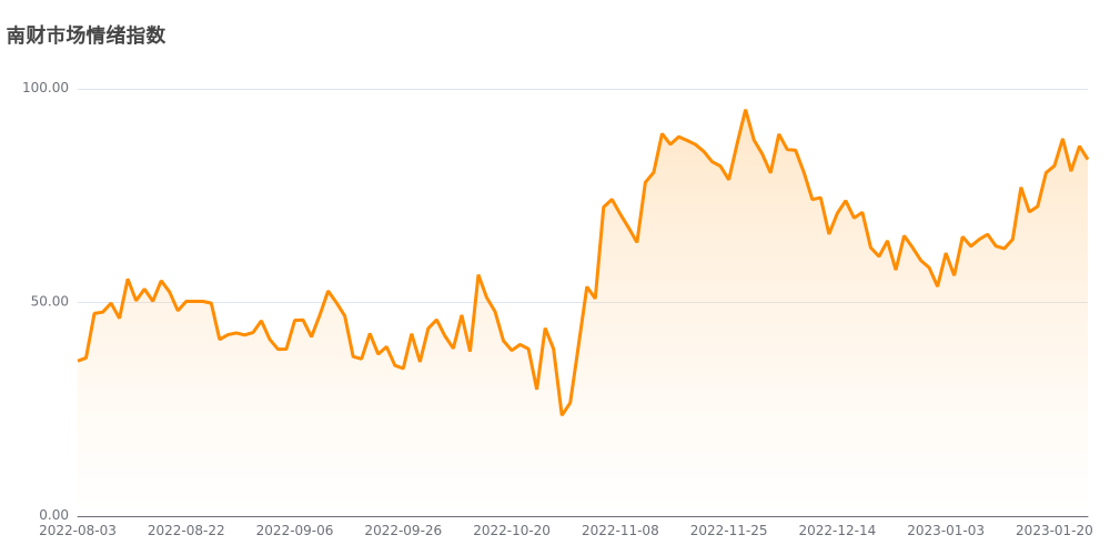 今日南财市场情绪指数为83.5,较前一交易日86.6下跌,市场投资热度降低。