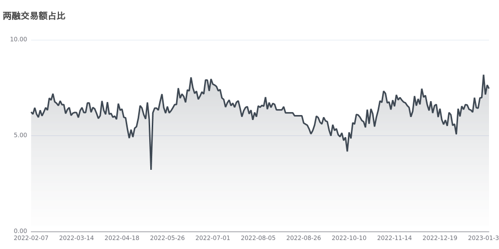 今日该指标值为7.46%,目前该指标处于近一年较高区间,认为当前A股市场相对较强。反映场内投资者借钱炒股的杠杆水平,该指标越高说明杠杆水平越高,即投资者认为当前市场较强,反之则说明投资者认为市场相对较弱,因而与上证指数存在较强的正相关性。