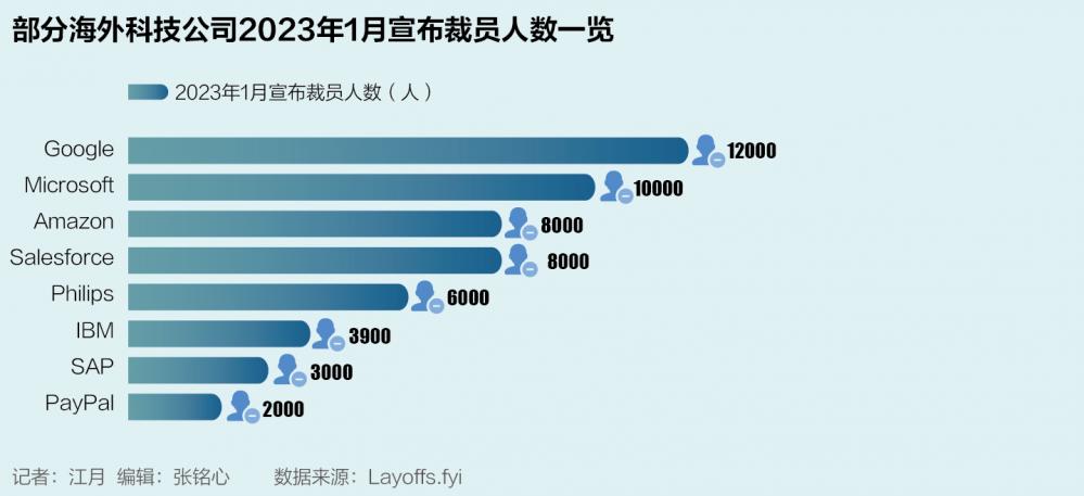 其他巨头方面,从2022年11月至2023年1月,微软在1月18日宣布将裁员1万人,Salesforce、飞利浦、思科、SAP、Uber、PayPal等也纷纷减员。